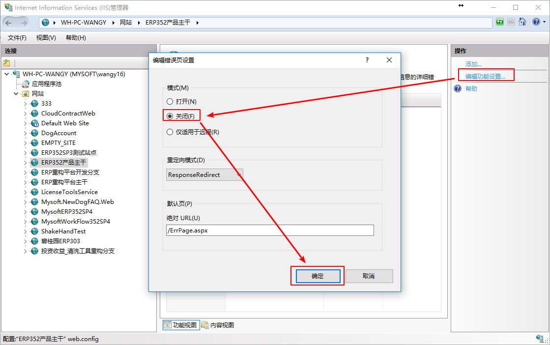 在IIS管理器中找到站点,双击点击右侧的.Net错误页功能。